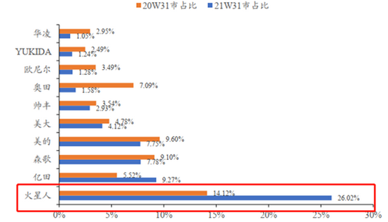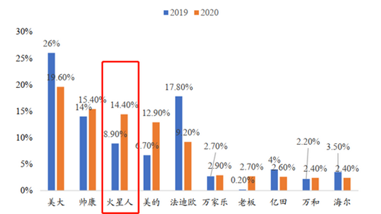 根据奥维数据KA渠道数据分析,线下市场中浙江美大(002677,股吧)目前市占率第一,2020年底市占率为19.6%,同比下降6.4个百分点;火星人市占率为14.4%,同比提升5.5个百分点。由此可见,火星人线下直营渠道布局已显见成效。