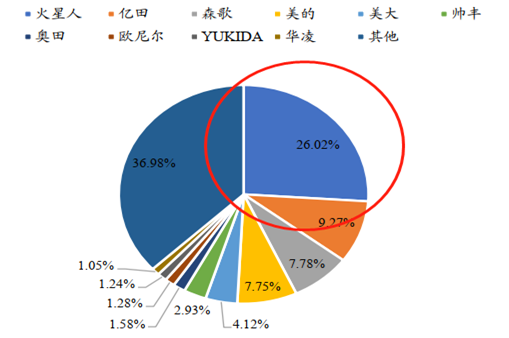 森歌、美的、亿田在销额市占率上处在第二梯队,销额市占率在5%-10%区间。